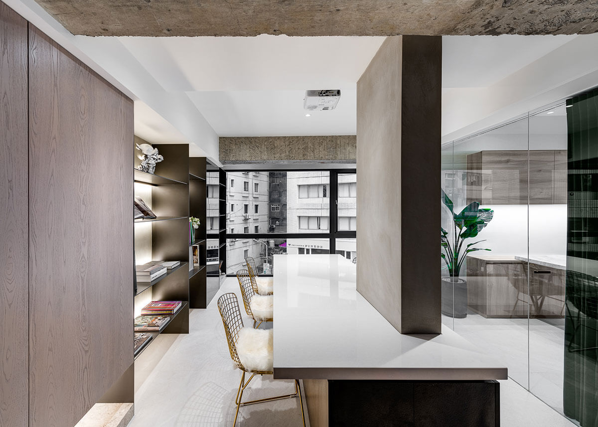原先欲將公領域劃設為全開放式場域,卻因中間樑柱無法拆除,而形成一處畸零,我們索性將缺陷轉化為亮點,與之結合桌面,以中島概念發展出「家」的情境;使原本稍有距離感和帶有正式氛圍的會議桌間,頓時軟化了許多,亦形成和實牆作用相同的隔間,切割空間中的象限維度。而在縝密的計算過後,我們也發現,將天花板刻意壓低嵌以照明,能夠使粗大的樑柱,視覺上縮小,減低壓迫感,蛻皮後的RC鋼構,銜接輕盈量體,整體視域達至半通透的微光透亮。